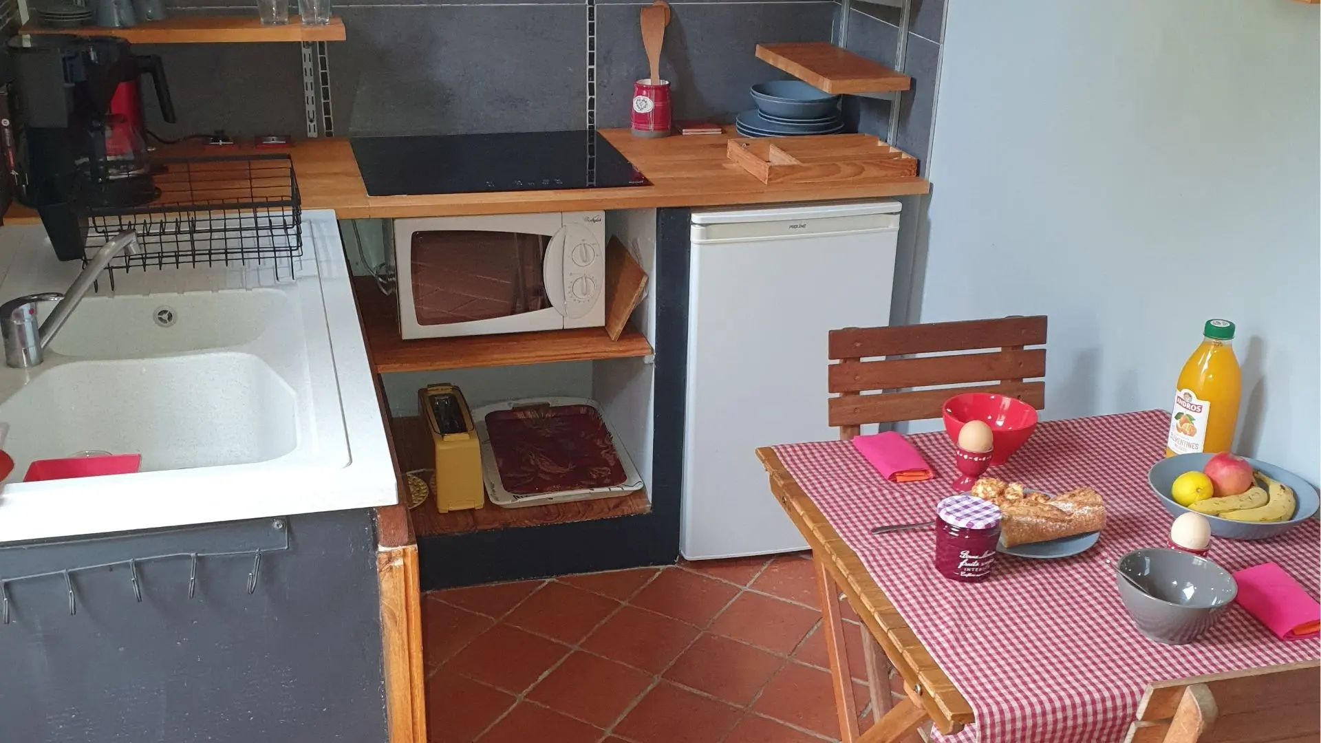 Une table de jardin à l'entrée du gîte vous permet de déjeuner ou dîner en extérieur. L'espace piscine dispose de transats, d'un coin barbecue au bois avec table à manger.